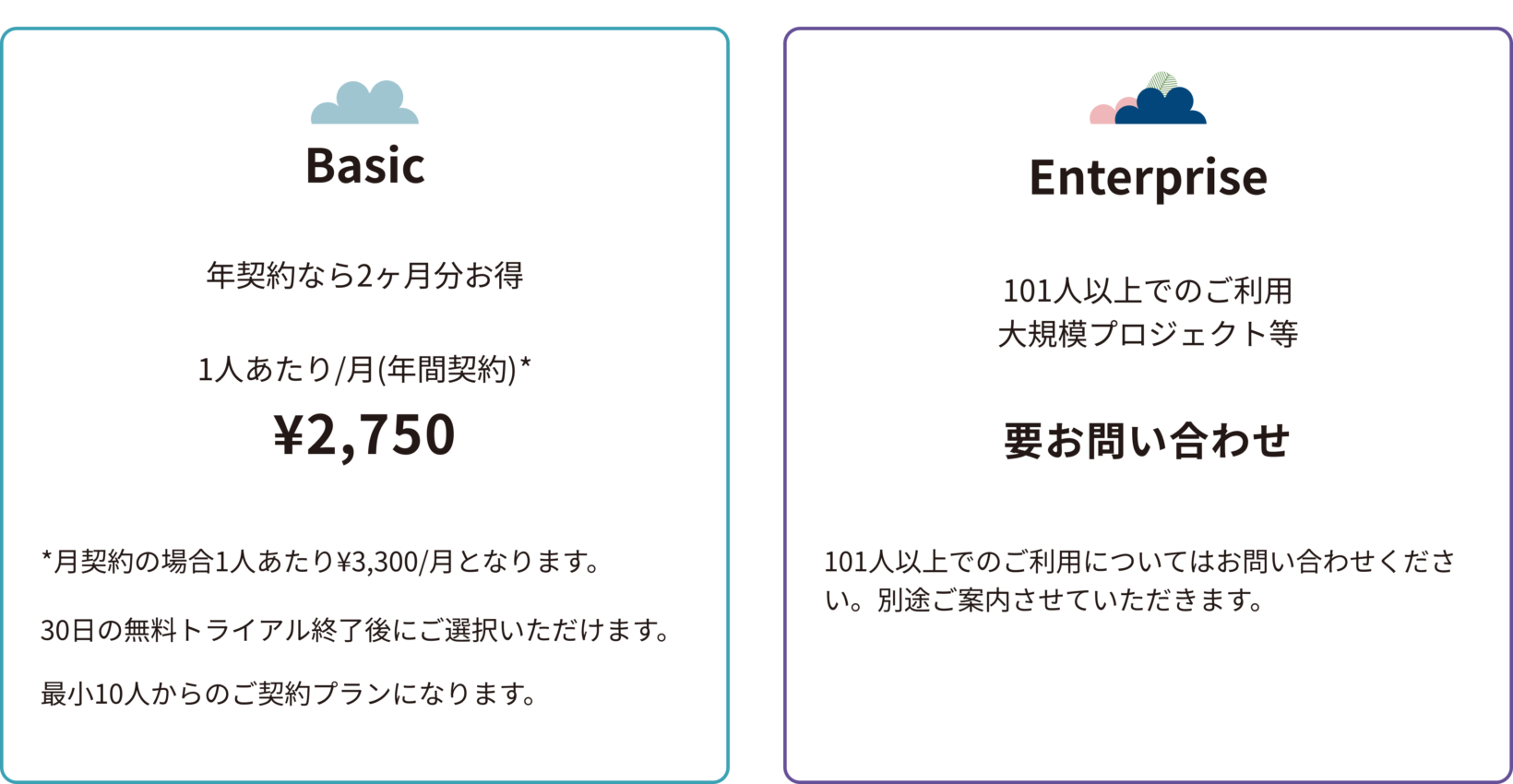 Basic、Enterpriseの2種類から、ご利用人数に合わせてお選びいただけます。