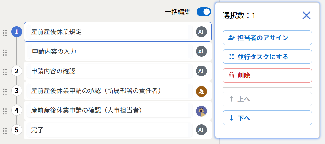 - タスクリストの右上にある[一括編集]のトグルボタンをONにします。